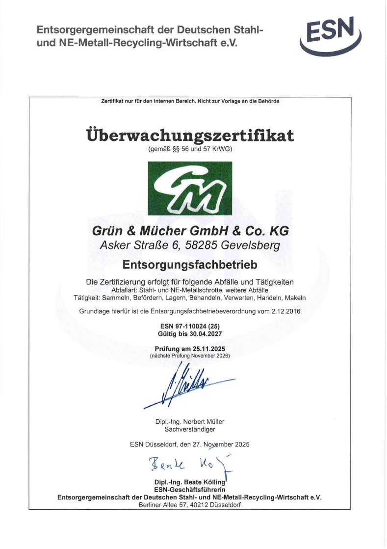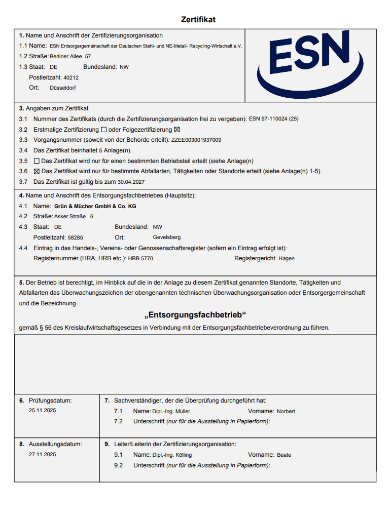 Die Grün & Mücher GmbH & Co. KG ist als Entsorgungsfachbetrieb seit Einführung der Verordnung ( EfbV ) im Jahre 1997 zertifiziert.